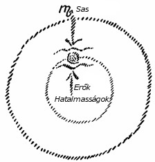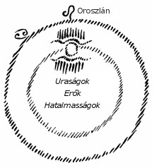 Ide rajzolom a második körzetet. Ez a régi Nap eredeti nagysága, a Nap ugyanis összehúzódott a korábbi tágabb kerületéhez képest. Azáltal, hogy összehúzódott, sűrűbbé vált. Ennek következtében a régi Napon már nemcsak hőszubsztancia van, hanem megsűrűsödött hőszubsztancia, gáznemű, levegőszubsztancia is. Kívülről, a külső környezetéből hatnak most a bölcsesség szellemei is a már korábban említett lényekkel együtt, belülről pedig az exuziák és a dünamiszok, vagyis a formaszellemek és a mozgás szellemei. Most pedig éppen úgy, mint hajdan a régi Szaturnuszon, a következő történik. Bizonyos áramlatok keletkeznek, amelyeket a Napot körülvevő szellemi lények hoznak létre, s ebben most a bölcsesség szellemei is részt vesznek. Ezáltal ezek az áramlások valamivel sűrűbbek, mint azok, melyeket a régi Szaturnuszon csupán a trónok keltettek fel. Belül a Nap tömege összehúzódik és a két áramlat között az egyik füstgömb a másik után tömörül össze. A Nap gömbje abban különbözik a Szaturnusz gömbjétől, hogy a Szaturnusz alapjában véve összes lényével együtt csak hőszubsztanciából állt, és benne minden úgyszólván csak sürgött-forgott a térben, a Napon azonban mindent átjár az éter, az éterikus testiség. Ha gázsűrűségű is, de áthatja az éterikus testiség, és ezáltal az egész gömb él, bensőleg eleven lény. Míg a Szaturnusz bensőleg mozgékony lény, csupa mozgás, amíg mozgását az Oroszlán meg nem állítja, a Jupiter - nevezhetjük Jupiternek is, mert az égen lévő Jupiter bolygó annak idején arról vált le, ami a régi Nap ismétlődéseként létrejött - a Jupiter bensőleg eleven. A régi Napon tehát ott keringenek a gömbök, melyek eleven gömbök, nagy élőlények. Az Oroszlán helyett most gondoljanak az Állatöv egy másik régiójára, arra, amit korábban a Sas régiójának neveztem. Itt keletkeztek eredetileg ezek a gömbök, innen indult ki eredetileg a Nap gömbjének, ennek a kozmikus térségben lévő eleven gömbnek a létrejötte. Amikor ez az eleven gömb egyszer körbejárt, az egész kört megtette, ismét visszaérkezik a Sas régiójába. Most azonban valami más történik. Míg korábban ez a gömb ezen a helyen kezdett el bensőleg élni, most, amikor ugyanerre a helyre visszaérkezik, ugyanaz a hatás, amely eredetileg életre keltette, megöli. Egyik gömb a másik után hal meg. Amikor aztán már mind meghalt és nem keletkezik új helyette, véget ér a régi Nap élete. Éppen abban állt az élete, hogy itt mindig új gömbök keletkeztek, amelyek végül itt fedték egymást, azon a helyen, ahol a világűrből jövő hatás megölte őket. Ezt a halálos döfést, amit a Nap a világűrből kapott, a skorpiócsípéshez érezték hasonlónak és elnevezték a Skorpió régiójának. Így az égnek ezen a részén két csillagkép látható: a Sas, amely a holt anyagot életre kelti és a Skorpió, amely a gyilkos erőket küldi le. Azt mondhatjuk tehát, hogy az Oroszlán régiójában az Állatöv azon erői működnek, amelyek az emberkezdemény fizikai testének kezdeti mozgását nyugalmi állapotba hozták, a Skorpió régiójában pedig azok az erők hatnak, amelyek képesek magát az életet megölni. Meg fogunk még ismerkedni mindezeknek a mai megváltozott viszonyokkal való összefüggésével is, de ez csak lassan, fokozatosan történhet. Az eredeti körülményeket ugyanis ma már sűrű maja, sűrű fátyol vonja be. De most menjünk tovább. Az ezután következő viszonyokat már nem kell olyan részletesen elemeznünk, hiszen már tisztában vagyunk az elnevezések és a folyamatok értelmével. Csak egy dologra szeretném még emlékeztetni önöket, ez pedig a következő: Tulajdonképpen milyen test a Szaturnusz? Hőtest. Ha a Szaturnuszt látják, teljesen hibás volna feltételezni róla, hogy olyan test, amely más égitestekkel, például a Jupiterrel vagy a Marssal összehasonlítható. Ami a Szaturnuszon van, valóban nem más, mint hőtér. S az, hogy ilyennek látják, amilyennek látják, onnan ered, hogy egy megvilágított téren keresztül nézik. Győződjenek meg róla, hogy milyennek mutatkozik egy meg nem világított tárgy, ha egy megvilágított téren keresztül nézzük; kékesnek látszik. Tanulmányozhatják ezt az egyszerű gyertyalángon is; a fényes láng közepe kék. Ha valami sötétet megvilágított rétegen keresztül nézünk, az mindig kék. Tudatosan mondom ezt, tudom, hogy az a veszély fenyeget, hogy a modern idők mechanikus optikája szempontjából badarság, amit mondok. De megint csak ez a badarság a valóság. A mai fizika nem tudja, hogy miért látszik az égbolt kéknek. Azért látszik kéknek, mert sötét, mert fekete, és mert az átvilágított térségen keresztül látjuk. Minden, ami sötét, kéknek hat, ha átvilágított rétegen keresztül látjuk. Ezért látszik a Szaturnusz is, ha megfigyeljük, kissé kékes égitestnek. Az itt elmondottak teljesen megegyeznek a tudomány tényeivel, csak a tényekkel kapcsolatban kitalált fantasztikus elméletekkel nem egyeznek meg. Túl messzire vezetne, ha kitérnék a Szaturnusz ún. gyűrűinek keletkezésére a mai szemszögből nézve. Itt ugyanis arról van szó, hogy minden Szaturnusznak van egy neutrális, egy lelki meleg rétege és egy fizikailag érzékelhető meleg rétege. Ezeknek a különböző rétegeknek a megvilágított térségen át való szemlélése azt a csalódást kelti, mintha egy gázgömbbel volna dolgunk, amit bizonyosfajta porból álló gyűrű vesz körül, pedig csak optikai csalódással van dolgunk. A Szaturnusz ma is csak hőből álló égitest. Ezeket a dolgokat ilyen összefüggésükben kell elmondani, különben nem érthetnénk meg őket. Minden Szaturnuszt úgy kell tehát tekintenünk, hogy lényegében hőszubsztanciából áll, és vele kapcsolatban m