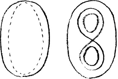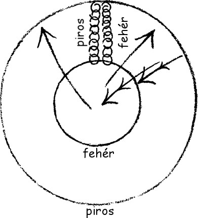 Most képzeljenek el valami mást: azt, hogy az ember lénye születése és halála között a Földhöz kötődik. Azért kötődik a Földhöz, mert lelke a születés és halál közötti állapotban, miután egy ideig a fényben élt, újra meg újra éhezik a nehézkedésre, visszatér a nehézkedés állapotába. Amikor olyan állapot következik be – erről beszélünk még –, hogy már nem vágyódik a nehézkedés után, az ember egyre jobban követi majd a fényt. Ez egy bizonyos határig történik (a rajzon piros). Egy bizonyos határig követi a fényt, és mire megérkezik a világmindenség külső perifériájához, addig elhasználja azt, amit születése és halála között a nehézkedéstől kapott. Ekkor újra vágyakozni kezd a nehézkedés után, és ismét újabb megtestesülés felé veszi az útját. Így tehát a halál és az újabb születés közötti időben, a lét éjféli óráján is felmerül valamilyen vágyakozás a nehézkedés után. Ez a legáltalánosabb fogalma annak a vágyakozásnak, amelyet az ember újabb földi életéhez való visszatérés iránt érez. Mielőtt azonban az ember visszatér újabb földi életéhez, át kell haladnia a többi szomszédos égitest szféráján. Ezek különféleképpen hatnak rá, és fizikai életébe azután magával hozza ezeknek a hatásoknak az eredményét, miután fogantatása révén belépett ebbe a fizikai életbe. Ebből látható, milyen jelentős kérdés az, hogy hogyan helyezkednek el a csillagok azokban a szférákban, amelyeken az ember visszatérőben áthalad. Mert az ember földi nehézkedés utáni vágya különféleképpen alakul, attól függően, ahogy a csillagszférákon áthalad. Nem csak a Föld sugároz ki olyanfajta nehézkedési erőt, amelyhez az ember visszavágyik, nehézkedésével a többi égitest is hat rá, amikor újabb élete felé közeledve azok szféráján áthalad. A visszatérő ember mindenesetre különböző helyzetekbe kerülhet, ezek igazolják például a következő állítást: a Földre visszatérő ember ismét a földi nehézkedésben való életre vágyik. De előbb a Jupiter szféráján halad át. A Jupiterből is nehézkedési erő sugárzik, ez alkalmas arra, hogy a földi nehézkedés utáni vágyhoz valami örömtelivel járuljon hozzá. A lélekben tehát nemcsak élni fog a földi nehézkedés utáni vágy, hanem ez a vágy örömteli hangulati árnyalatot is kap. Az ember áthalad a Mars szféráján. Vágyakozik a földi nehézkedés után. Az öröm hangulata már benne él. A Mars nehézkedése is hat rá, és a földi nehézkedésre örömmel vágyódó lelkébe olyan aktivitást ültet be, olt bele, hogy adja át magát ennek a földi nehézkedésnek, hogy a következő születése és halála közti fizikai életben erőteljesen felhasználja. Ezzel a lélek már eljut odáig, hogy tudatalattijának mélységeiben megjelenik az impulzus a földi nehézkedés utáni határozott vágyódásra, arra, hogy erőteljesen felhasználja ezt a földi inkarnációt, és így vágyódó öröme, örömteljes vágya intenzív kifejezéshez jusson. Az ember áthalad még a Vénusz szféráján is. Az erő iránti örömteljes vágyódáshoz így hozzájárul az élet feladatainak szeretetteljes megragadása is. Mint látják, az égitestekből kiinduló különböző nehézkedésekről beszélünk, és ezeket összefüggésbe hozzuk mindazzal, ami a lélekben élhet. A kozmikus térbe kitekintve megpróbáljuk a térben fizikailag kiterjedt jelenséget egyúttal morálisan is megközelíteni. Ha tudjuk, hogy a nehézkedésben akarat él, a fény viszont ellentétes az akarattal, akkor azt mondhatjuk: a Marsról, a Jupiterről és a Vénuszról fény sugárzik vissza; a nehézkedés erőiben ugyanakkor a fény módosító hatása is ott él. Tudjuk, hogy a fényben elhaló kozmikus gondolatok élnek, a nehézkedés erőiben pedig az akarati csírák révén létesülő világok. Mindez átsugárzik a térben mozgó lelkeken. A világot fizikailag és ugyanakkor morálisan is szemléljük. A fizikai és a morális nem egymás mellett létezik, az ember csak szűklátókörűsége miatt hajlamos ezt úgy kifejezni, hogy a fizikai az egyik oldalon van, a morális meg a másikon. – Pedig ezek csak különböző látószögek, mindez önmagában véve egységes. A fény felé fejlődő világ egyúttal az elégtétel, a megnyilatkozó elégtétel felé fejlődik. Az értelemmel teljes világrend a természetes világrendből nyilvánul meg. Tisztában kell lennünk azzal, hogy egy ilyen világszemlélethez nem filozófiai értelmezéssel jutunk, hanem azáltal növekszünk bele, hogy a szellemtudomány révén lassanként megtanuljuk a fizikai fogalmak szellemiesítését; ezáltal világnézetünk magától moralizálódni fog. Ha megtanuljuk, hogy a fizikai világon át olyan világba tekintsünk, ahol megszűnt, ami fizikai, és ahol szellemiség van jelen, akkor felismerjük, hogy moralitás van benne. Bizonyos képzetekből az emberek már ma is rájöhetnének arra, hogy az imént elmondottakat, mondhatni, teljes tudományossággal lelkük elé tárják. Ezt konklúzióképpen elmondom önöknek, bár legtöbbjük gondolkodásmódjukon kívül esik. Itt van tehát ez a görbe; nem ellipszis, abban különbözik tőle, hogy itt jobban kidudorodik (bal oldali rajz) – az építészetben sok ilyen vonalat látnak –, az ellipszis ilyenféle volna (szaggatottan). Ez ennek a görbének csak egy speciális alakja, a matematikai egyenlet megváltoztatásával ugyanis ilyen alakot is ölthet (lemniszkáta). Ez ugyanaz a görbe, mint a másik. Egyik alkalommal így megyek körbe, és itt zárom le, viszont bizonyos feltételek mellett nem megyek egészen fel, hanem így körbe, azután újra visszatérek és alul lezárom.