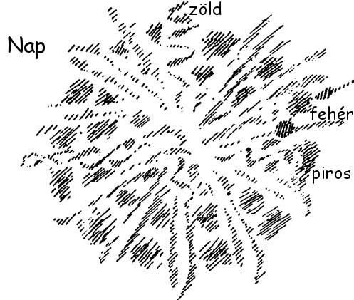 A XV-XVI. századig valóban tudták, hogy mi a levegő. Ma tudják, hogy a levegő oxigénből, nitrogénből és egyebekből áll, ez nem jelent sokkal többet, mintha valaki, mondjuk tudja az óráról, hogy üvegből és ezüstből van, de ezzel az óráról nem mondott semmit. A levegő kozmikus mivoltáról sem mondtunk ki semmit, ha azt mondjuk, hogy oxigénből és nitrogénből áll, akkor mondunk róla sokat, ha tudjuk, hogy a levegő a fény árnyéka. Tehát a második hierarchiának a Szaturnuszi melegbe való behatolása valóban a fénynek és a fény árnyékának, a levegőnek, a behatolása (zöld). Ahol pedig ez létrejön, ott van a Nap. A XIII-XII. században voltaképpen így kellett beszélni.