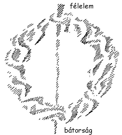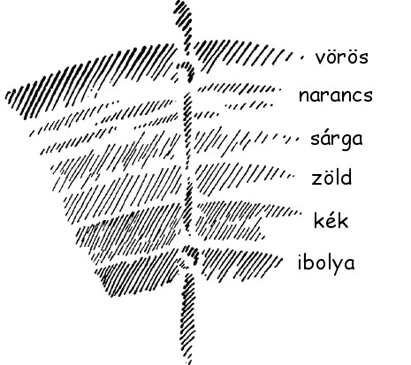 Most képzeljék el, hogy nemcsak a szivárvány van itt, hanem ha most keresztmetszetben rajzolom (lásd a következő rajzot), és a szivárvány így áll akkor itt előjönnek a lények, ott meg eltűnnek; itt a félelem, ott a bátorság. A bátorság újra eltűnik. Ez volna most a szem iránya, itt van a szivárvány, itt a piros, sárga és a többi. Ekkor kapja meg a szivárvány a vastagságát. Így már el tudjuk képzelni, hogy ebből a vizes elem jön létre. Ebben a vizes elemben olyan szellemi lények élnek, akik valóban képmásai a harmadik hierarchia lényeinek.