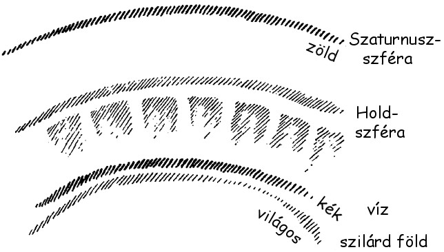 Most a következő a helyzet. Emlékezzünk rá, hogy az óperzsa korszakban az emberek számára a szilárd Föld jelentette az ellenállást, hogy meglássák az asztrális fénybe beírt feljegyzéseket. Amit az asztrális fény olyan módon tartalmaz, hogy a szilárd Föld nyújtja az ellenállást, az továbbsugárzik (a rajzon: világos). De csak a Hold-szféráig sugárzik. Nem halad tovább. Onnan ismét visszasugárzik, tehát úgyszólván megmarad a Földnél. A Föld révén látjuk tükröződni a titkokat. Azért maradnak meg, mert a Hold-szféra nyomást gyakorol. Térjünk át az egyiptomi-káldeai korszakra: A víz tükröződik a Földön (kék) és ami itt tükröződik, az a Szaturnusz-szféráig jut el. Ez nyomást gyakorol, ezáltal lehetséges, hogy az ember mindazzal, amit lát a Földön maradjon.
