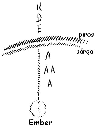 Valójában miben áll az, amire olyan intenzíven akarok utalni? Abban áll, hogy az emberek egyre inkább saját individualitásukban érzik magukat. Mialatt a gondolati világ átkerült a formaszellemektől az őskezdetekhez, az exusiáktól az archékhoz, az ember jobban érezte saját lényének gondolatait, mivel az archék egy fokkal közelebb élnek az emberhez, mint az exusiák. S amikor az ember érzékfeletti módon kezdett szemlélni, akkor a következő benyomása volt. Akkor azt mondta: Mondjuk, a sárga (lásd a 67. oldalon lévő rajzot), azon az oldalon van, amely érzékeim felé fordul, a vörös már a rejtett, az érzékeimtől elfordult oldalon.