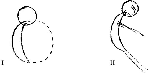 Először is még egyszer az emlékezetünkbe idézzük azt, ami már különféle megközelítésekből bizonyosan feltűnt, hogy az ember lényének három része különböző formákban jelenik meg131. Felhívtuk a figyelmet arra132, hogy a fej formája lényegében gömbforma, és hogy ebben a gömb alakú fejformában rejlik az emberi fej tulajdonképpeni testi léte. Azután felhívtuk a figyelmet arra, hogy az ember mellkasi része egy gömbtöredék, így tehát, ha sematikusan rajzolunk, a fejnek gömbformát, a mellkasi résznek pedig holdsarlóformát adunk, és tisztában vagyunk azzal, hogy ez a holdsarló- forma egy gömbtöredéket, egy gömb részletét tartalmazza. Ezért azt kell mondanunk: az ember mellkasi részének holdsarlóformája kiegészíthető. És csak akkor lesznek képesek helyesen tekinteni az ember-lény e középső tagjára, az ember mellkas-formájára, ha azt is gömbnek tekintik, de olyan gömbnek, amelyből csak egy részlet, egy holdsarló látható, s a többi része nem látszik (I. ábra)133. Talán látják ebből, hogy azokban a régebbi időkben, amikor inkább megvolt az emberekben az a képesség, hogy lássák a formákat, nem valótlant állítottak, amikor arról beszéltek, hogy a fej megfelel a napnak, a mellkas formája pedig a holdnak. És ahogy akkor, amikor nincs telihold, csak egy gömbtöredéket látunk a holdból, úgy az ember középső tagjából, a mellkas-formában is tulajdonképpen csak egy töredéket látunk. Ebből beláthatják, hogy az ember fejformája itt a fizikai világban egy viszonylag zárt dolog. A fej formája zárt dologként nyilvánul meg fizikailag. Bizonyos értelemben teljesen azonos azzal, aminek mutatja magát. A lehető legkevesebbet rejti el magából.