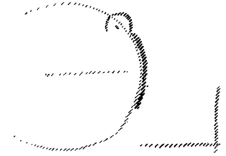 Ehhez azonban meg kell tanulnunk felemelni az antropológiát az antropozófiához, valóban elsajátítva egy érzéket azok iránt a formák iránt, amelyek a hármasan tagolt embert fejezik ki. A múltkor már említettem: az ember feje, az, ami főképpen fej, vajon nem gömbalakú-e egy egészen másik formában, és felhelyezve az organizmusunk egyéb részeire? (Ld. az ábrát.) És ugyancsak, amikor a mellkas-embert nézzük, hogyan jelenik meg előttünk? Tulajdonképpen úgy jelenik meg, hogy vehetnénk a fej egy darabját, csak megnagyobbítva, ahol itt van a hátgerinc. (Ld. az ábrát.) Ahogy a fej a maga középpontját magában hordja, a mellkas-emberben a középpont jóval távolabbra helyeződik. És ha ezt most elképzeljük, mint egy nagy fejet, akkor ez a nagy fej úgyszólván egy hátán fekvő emberhez tartozna. Úgyhogy, ha a gerincoszlopot egy nem teljes fejnek vesszük, akkor kapunk egy vízszintesen fekvő embert, és egy függőlegesen álló embert.